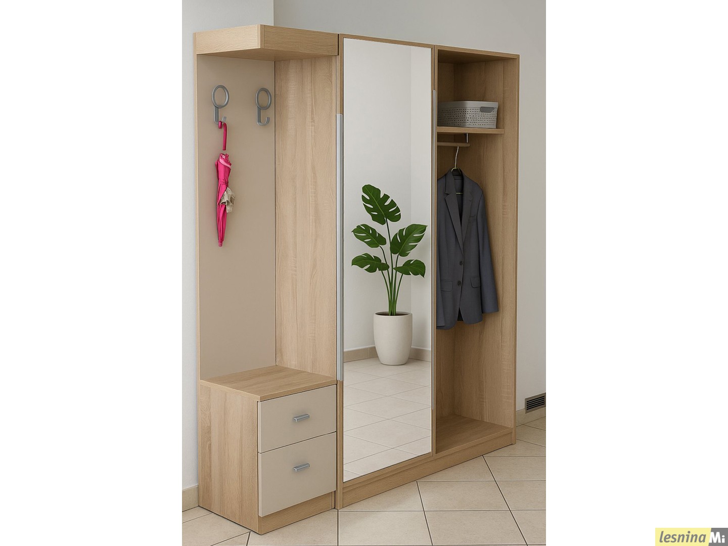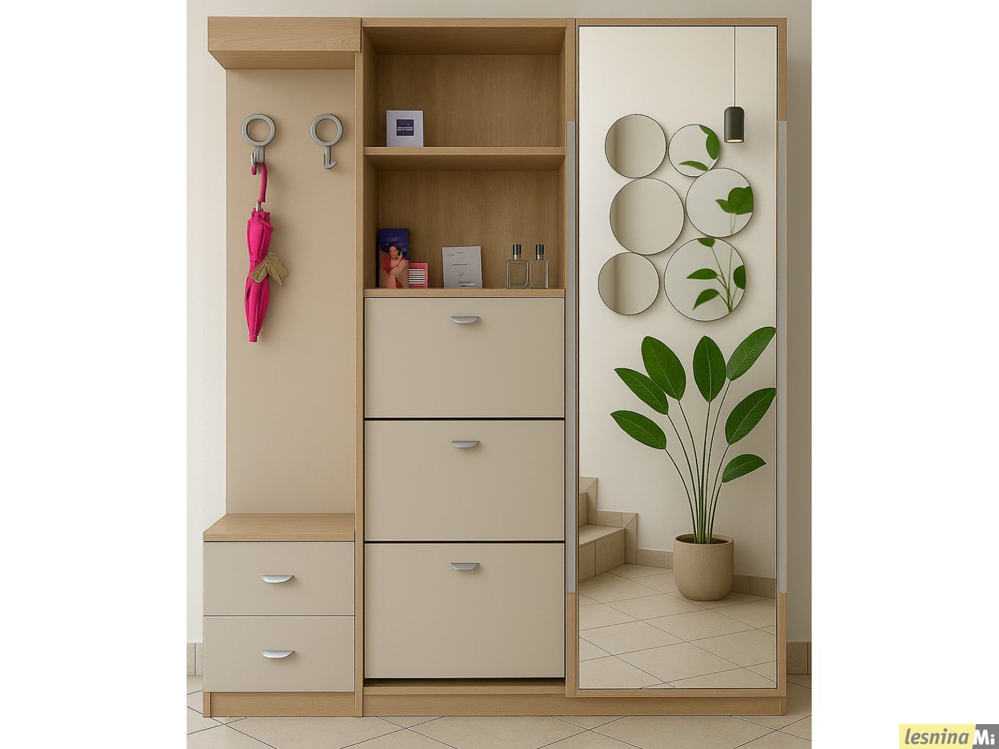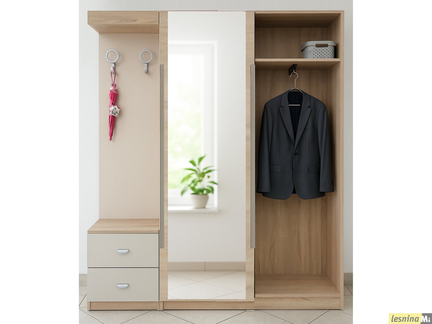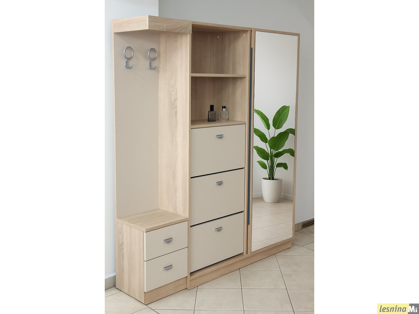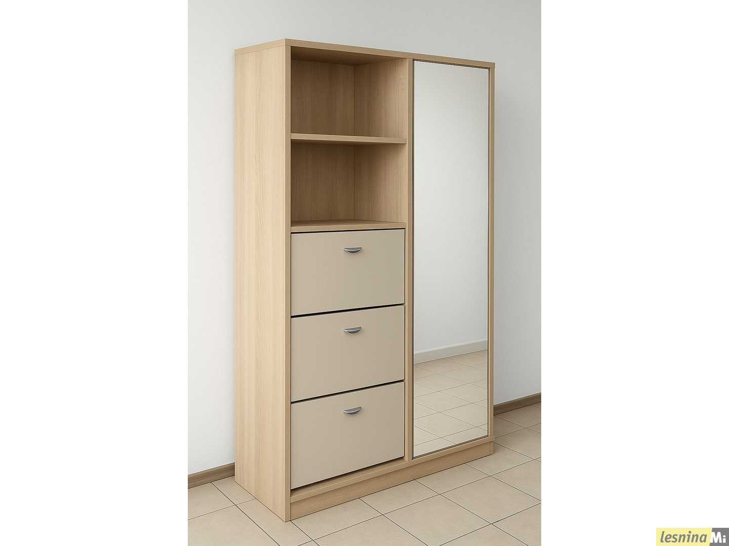 Во левото поле се наоѓаат 2 полици и 3 отклопни фиоки за чевли.